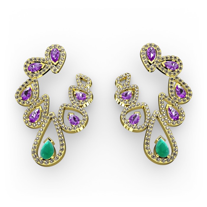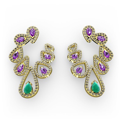 Kök zümrüt, ametist ve dumanlı kuvars 925 ayar altın kaplama gümüş küpe
