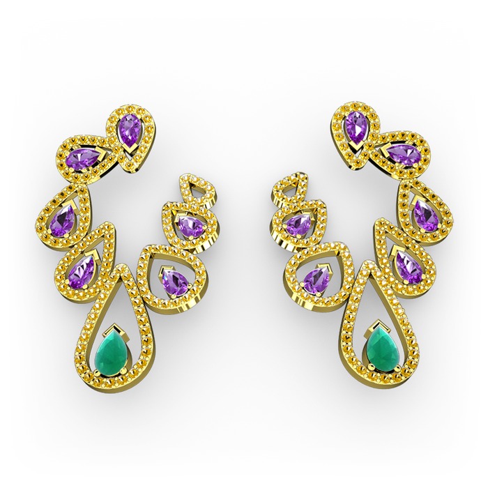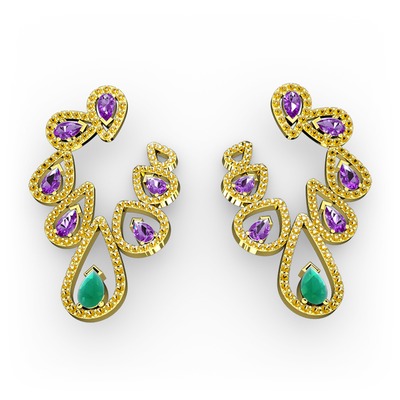 Kök zümrüt, ametist ve sitrin 925 ayar altın kaplama gümüş küpe