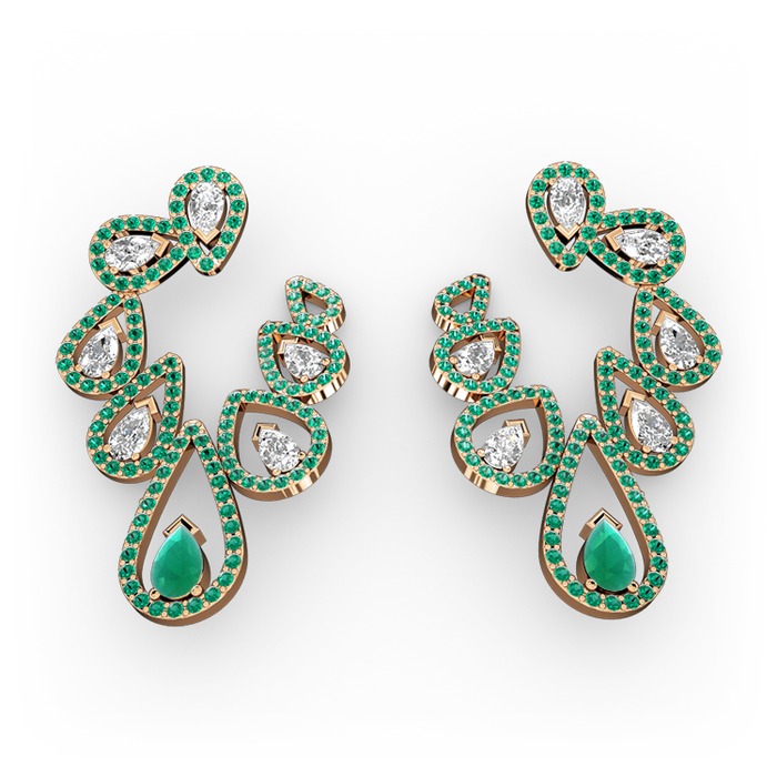 Kök zümrüt, beyaz zirkon ve yeşil kuvars 18 ayar rose altın küpe