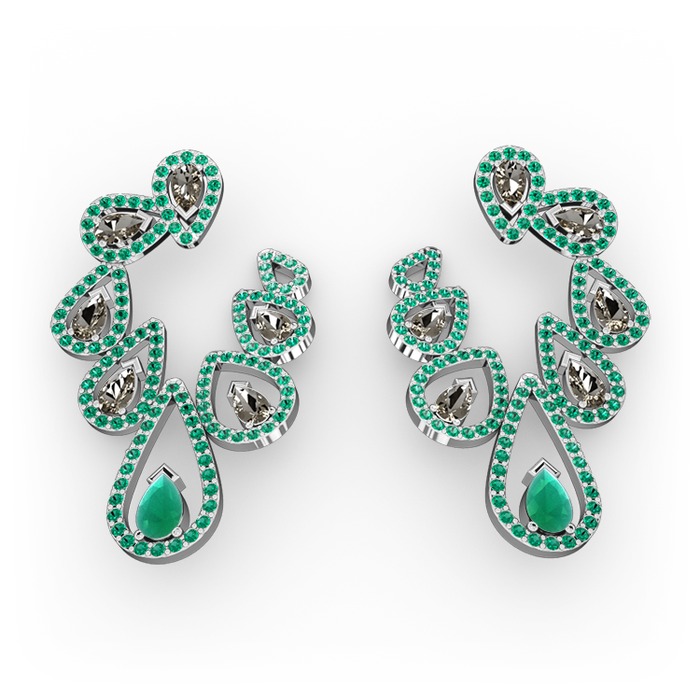 Kök zümrüt, dumanlı kuvars ve yeşil kuvars 14 ayar beyaz altın küpe