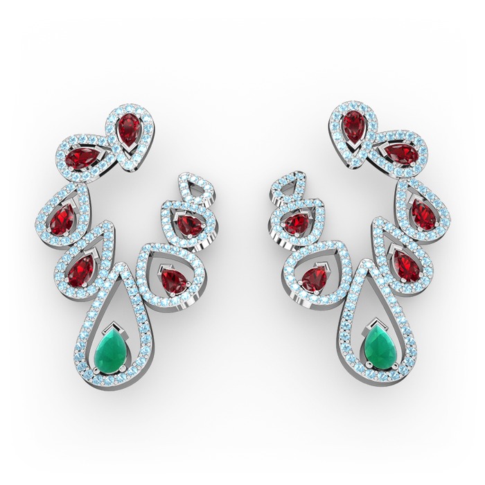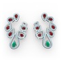 Kök zümrüt, garnet ve akuamarin 14 ayar beyaz altın küpe