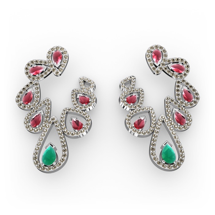 Kök zümrüt, kök yakut ve dumanlı kuvars 14 ayar beyaz altın küpe