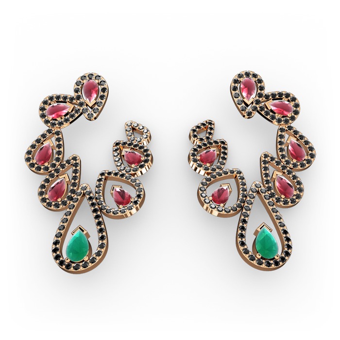 Kök zümrüt, kök yakut ve siyah zirkon 18 ayar rose altın küpe