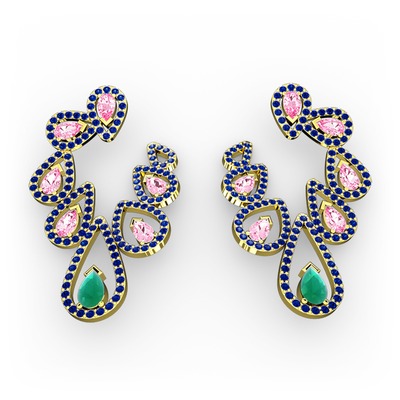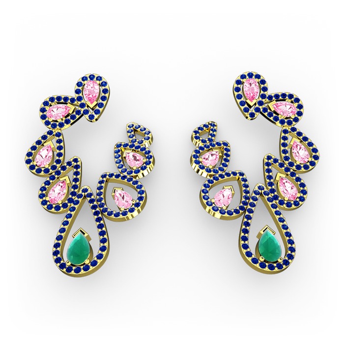 Kök zümrüt, pembe kuvars ve lab safir 18 ayar altın küpe