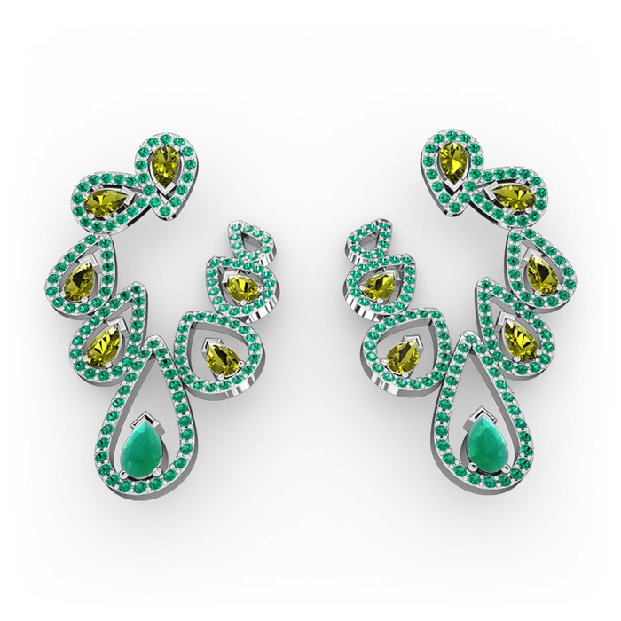 Kök zümrüt, peridot ve yeşil kuvars 14 ayar beyaz altın küpe