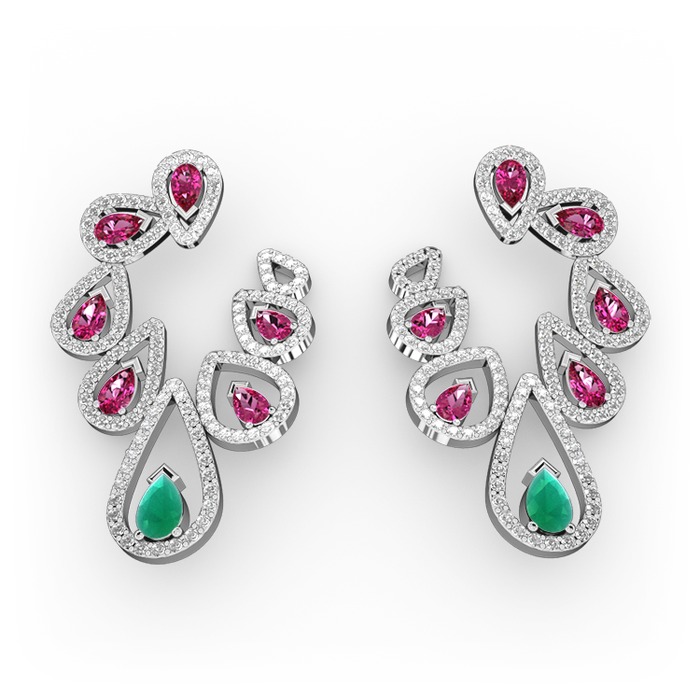 Kök zümrüt, rodolit garnet ve beyaz zirkon 14 ayar beyaz altın küpe