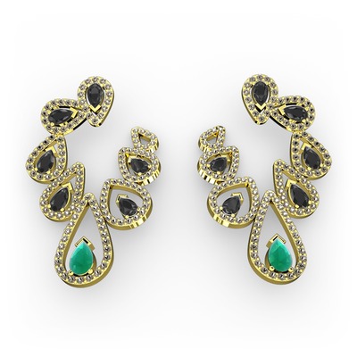Kök zümrüt, siyah zirkon ve dumanlı kuvars 8 ayar altın küpe