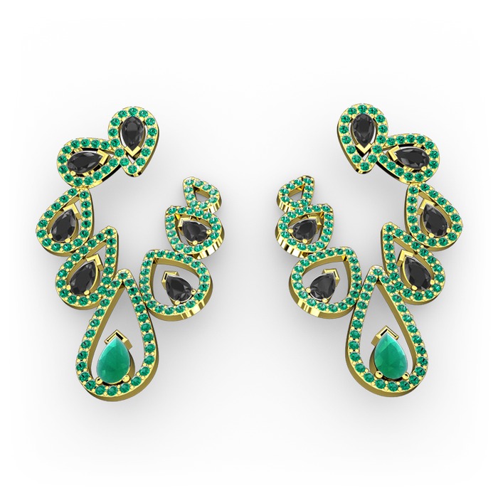 Kök zümrüt, siyah zirkon ve yeşil kuvars 8 ayar altın küpe