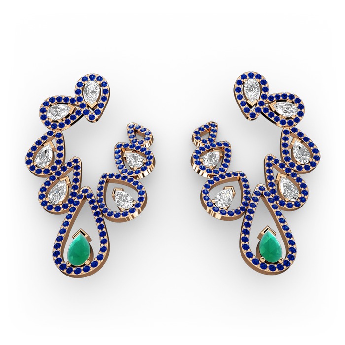 Kök zümrüt, swarovski ve lab safir 8 ayar rose altın küpe