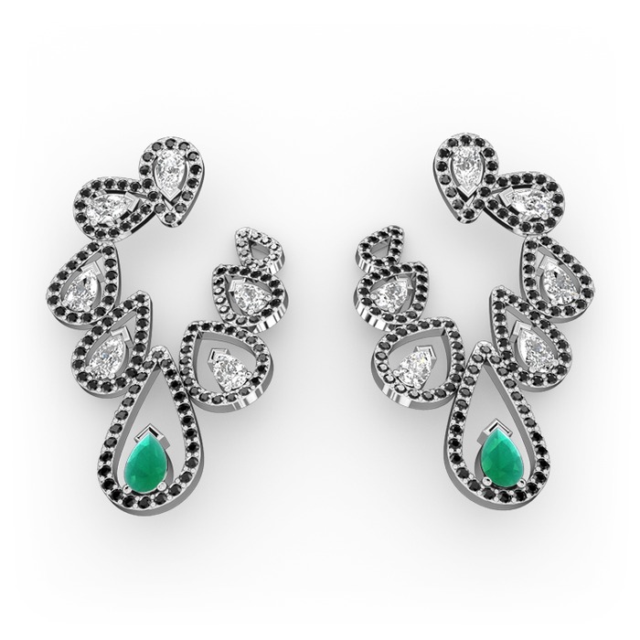 Kök zümrüt, swarovski ve siyah zirkon 8 ayar beyaz altın küpe