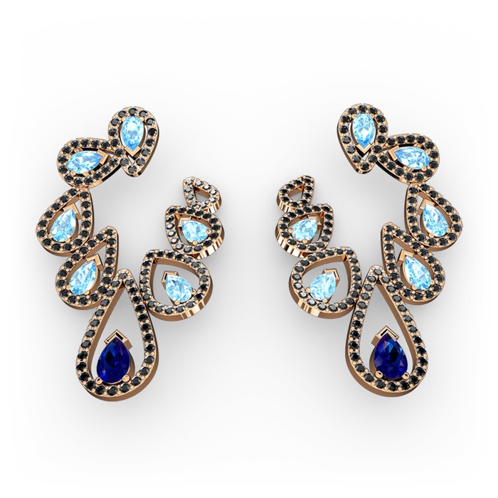 Lab safir, akuamarin ve siyah zirkon 8 ayar rose altın küpe