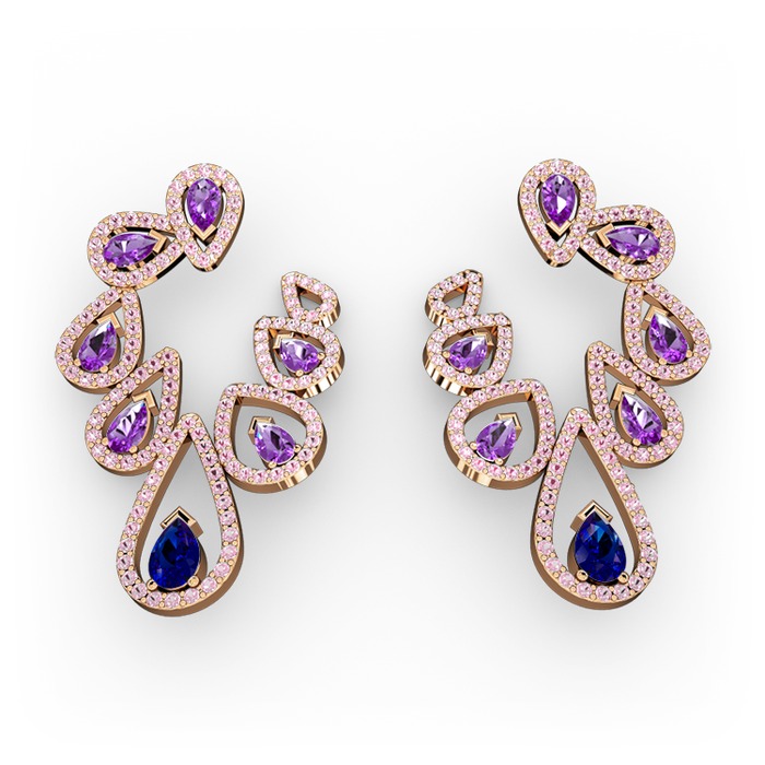 Lab safir, ametist ve pembe kuvars 925 ayar rose altın kaplama gümüş küpe