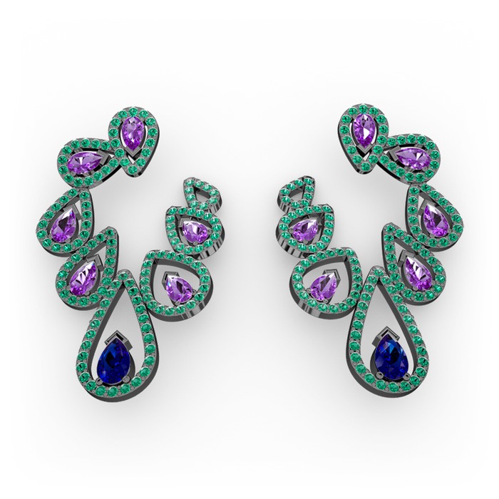 Lab safir, ametist ve yeşil kuvars 925 ayar siyah rodyum kaplama gümüş küpe