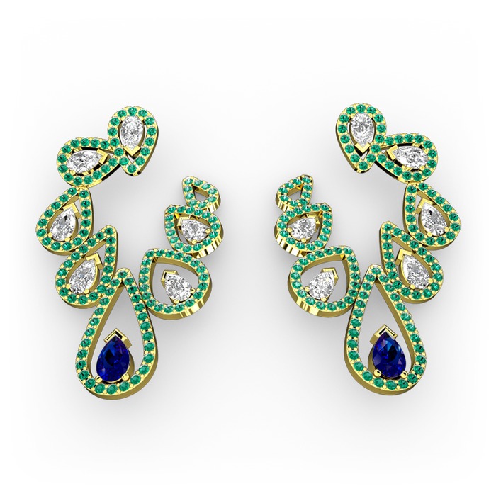 Lab safir, beyaz zirkon ve yeşil kuvars 925 ayar altın kaplama gümüş küpe