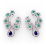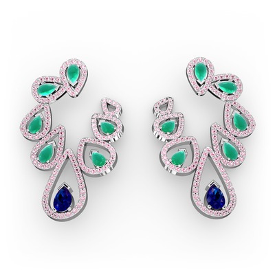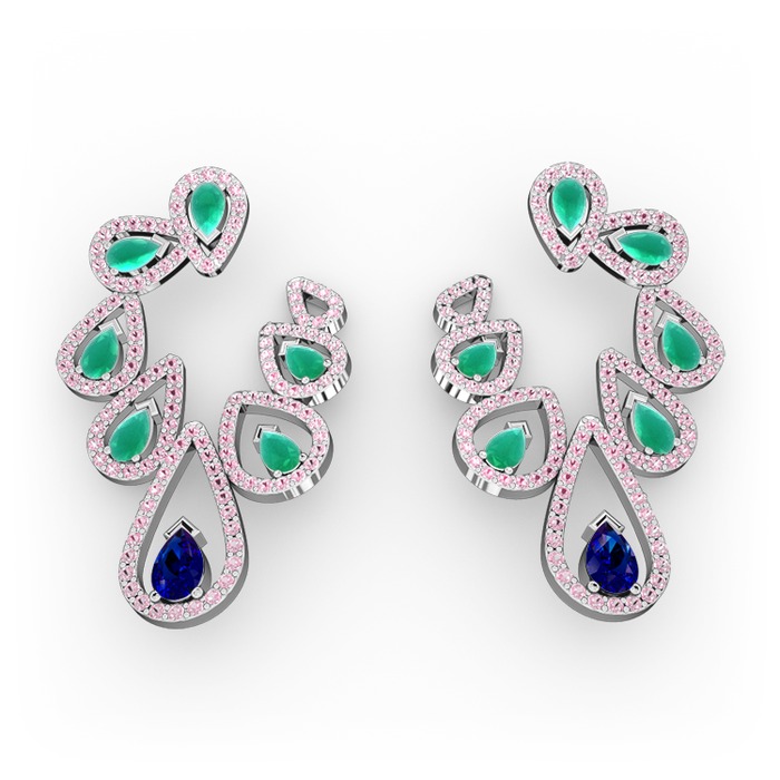 Lab safir, kök zümrüt ve pembe kuvars 18 ayar beyaz altın küpe