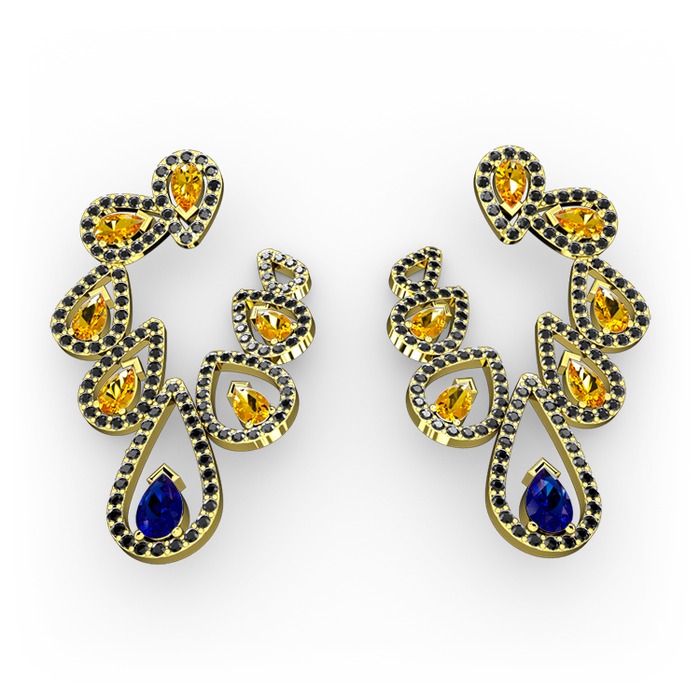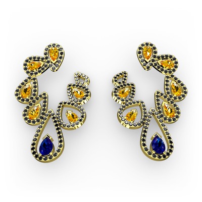 Lab safir, sitrin ve siyah zirkon 18 ayar altın küpe