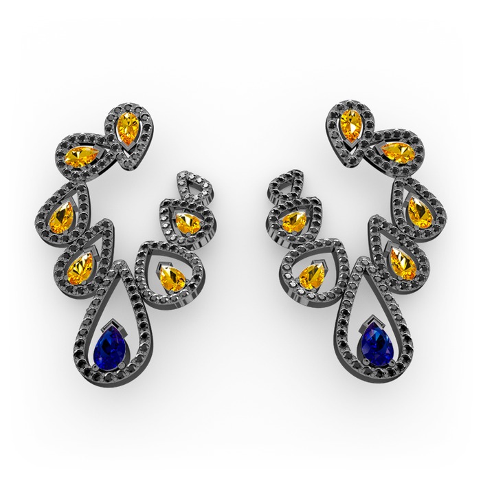Lab safir, sitrin ve siyah zirkon 925 ayar siyah rodyum kaplama gümüş küpe