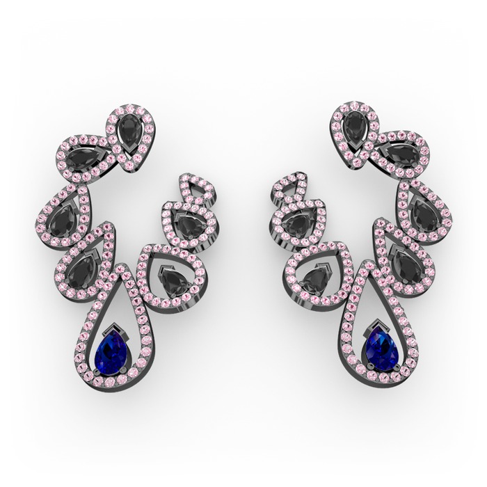 Lab safir, siyah zirkon ve pembe kuvars 925 ayar siyah rodyum kaplama gümüş küpe