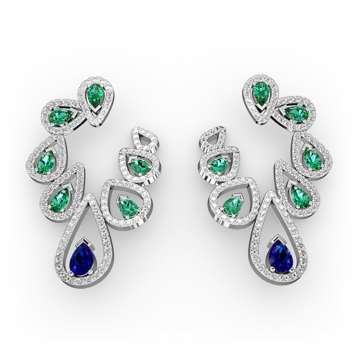 Lab safir, yeşil kuvars ve pırlanta 18 ayar beyaz altın küpe (2.882 karat)