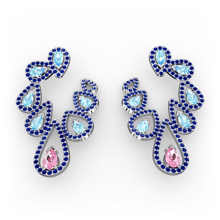 Pembe kuvars, akuamarin ve lab safir 18 ayar beyaz altın küpe