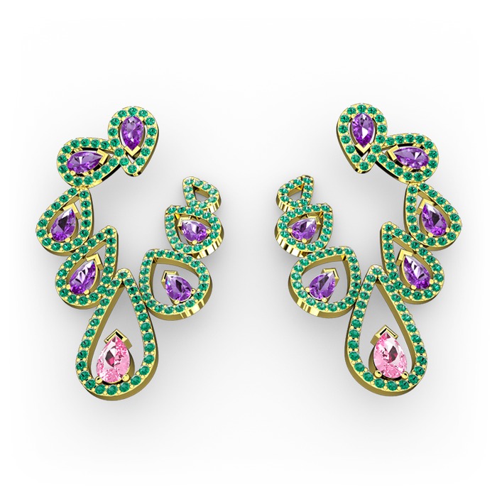 Pembe kuvars, ametist ve yeşil kuvars 925 ayar altın kaplama gümüş küpe