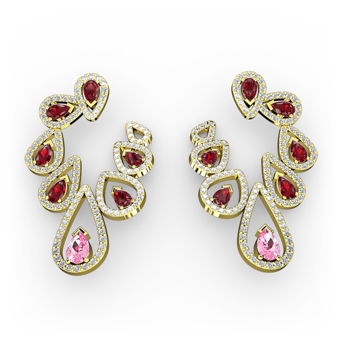 Pembe kuvars, garnet ve pırlanta 925 ayar altın kaplama gümüş küpe (2.882 karat)