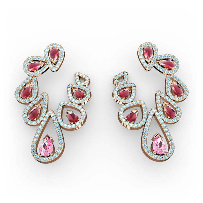 Pembe kuvars, kök yakut ve akuamarin 8 ayar rose altın küpe
