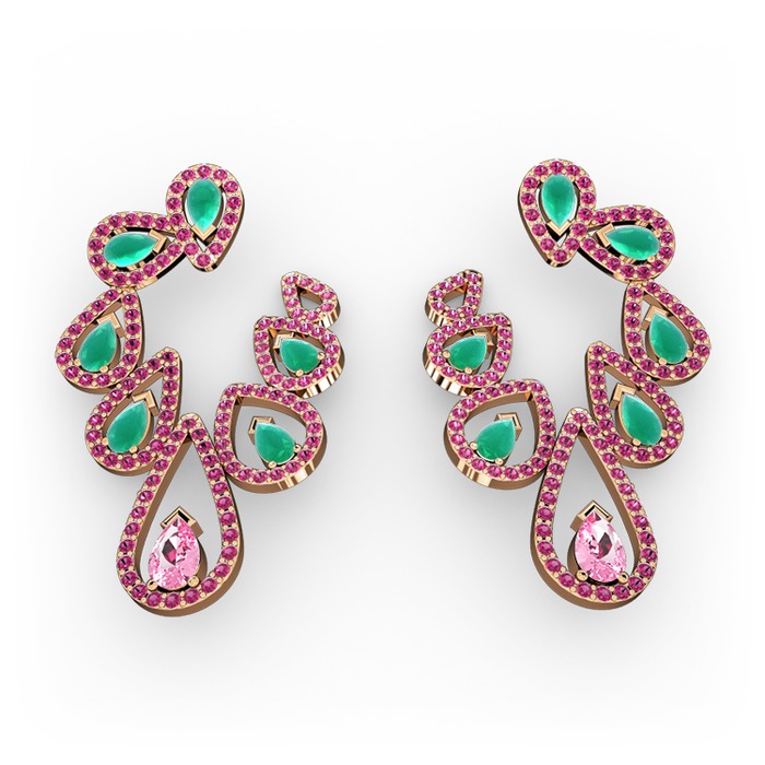 Pembe kuvars, kök zümrüt ve rodolit garnet 18 ayar rose altın küpe