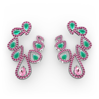 Pembe kuvars, kök zümrüt ve rodolit garnet 8 ayar beyaz altın küpe