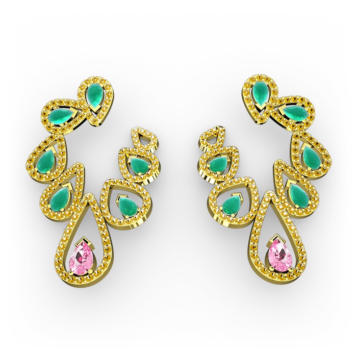 Pembe kuvars, kök zümrüt ve sitrin 18 ayar altın küpe