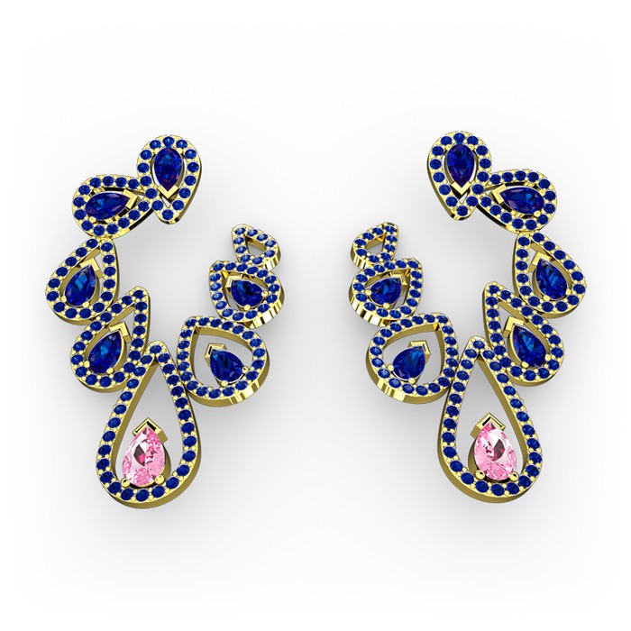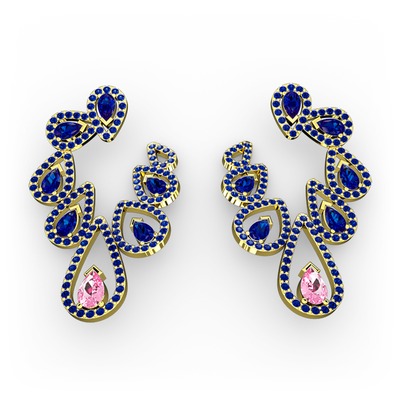 Pembe kuvars ve lab safir 18 ayar altın küpe