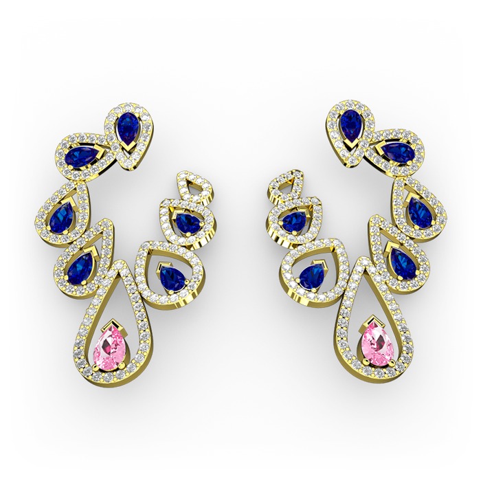 Pembe kuvars, lab safir ve swarovski 8 ayar altın küpe