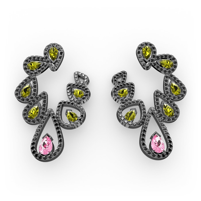 Pembe kuvars, peridot ve siyah zirkon 925 ayar siyah rodyum kaplama gümüş küpe