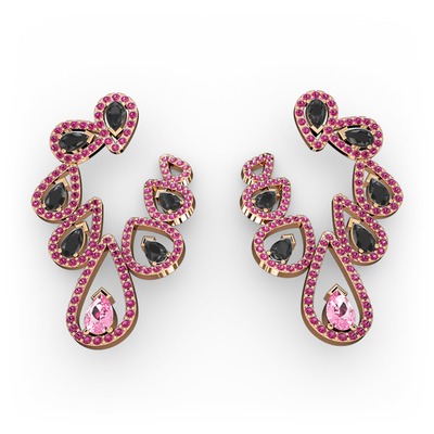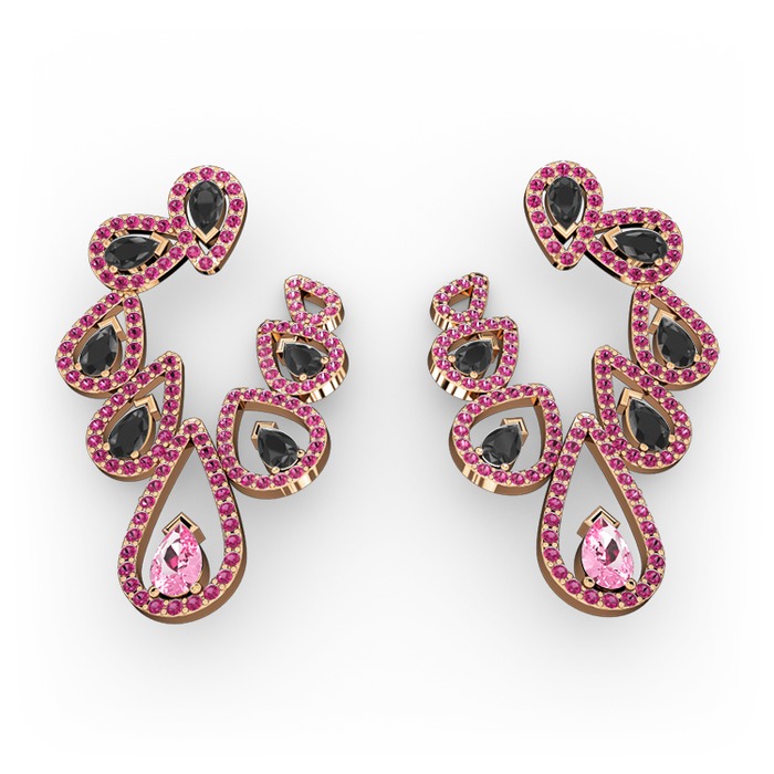 Pembe kuvars, siyah zirkon ve rodolit garnet 14 ayar rose altın küpe