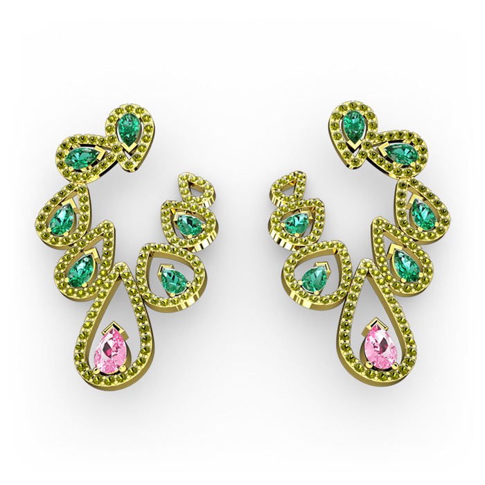 Pembe kuvars, yeşil kuvars ve peridot 8 ayar altın küpe