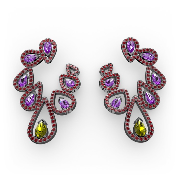 Peridot, ametist ve garnet 925 ayar siyah rodyum kaplama gümüş küpe