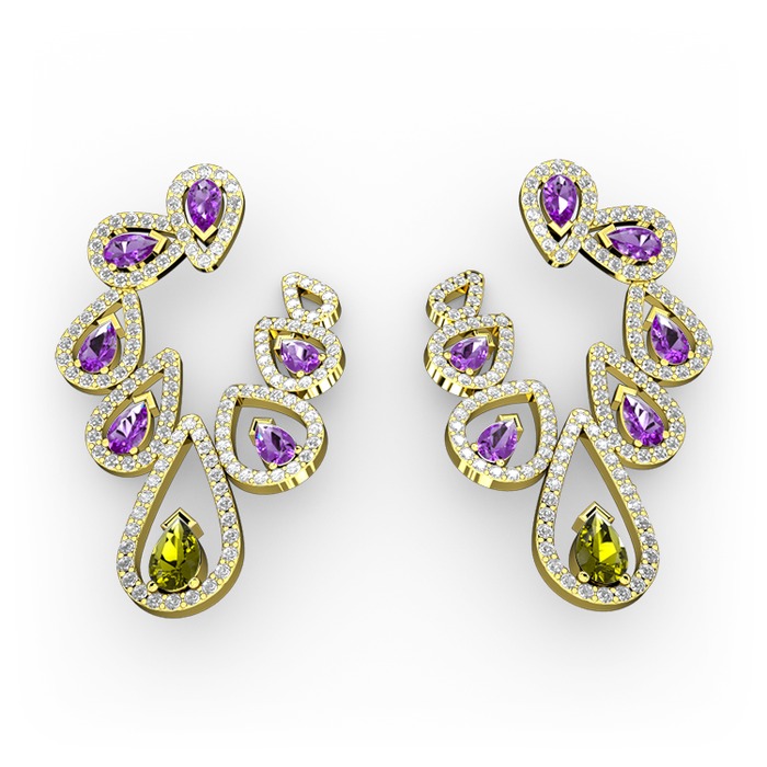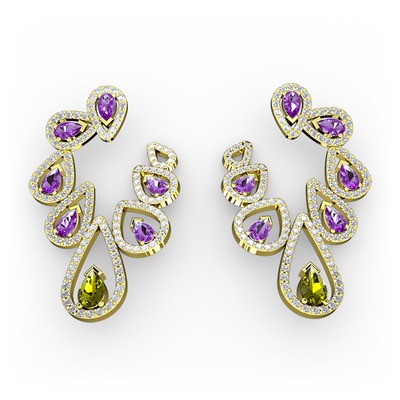 Peridot, ametist ve swarovski 8 ayar altın küpe
