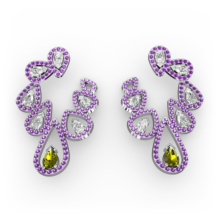 Peridot, beyaz zirkon ve ametist 14 ayar beyaz altın küpe
