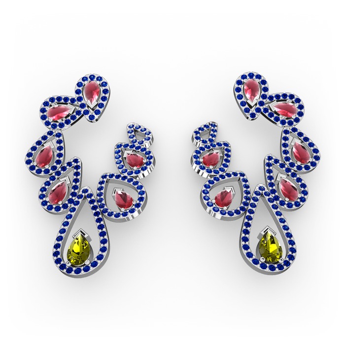 Peridot, kök yakut ve lab safir 14 ayar beyaz altın küpe