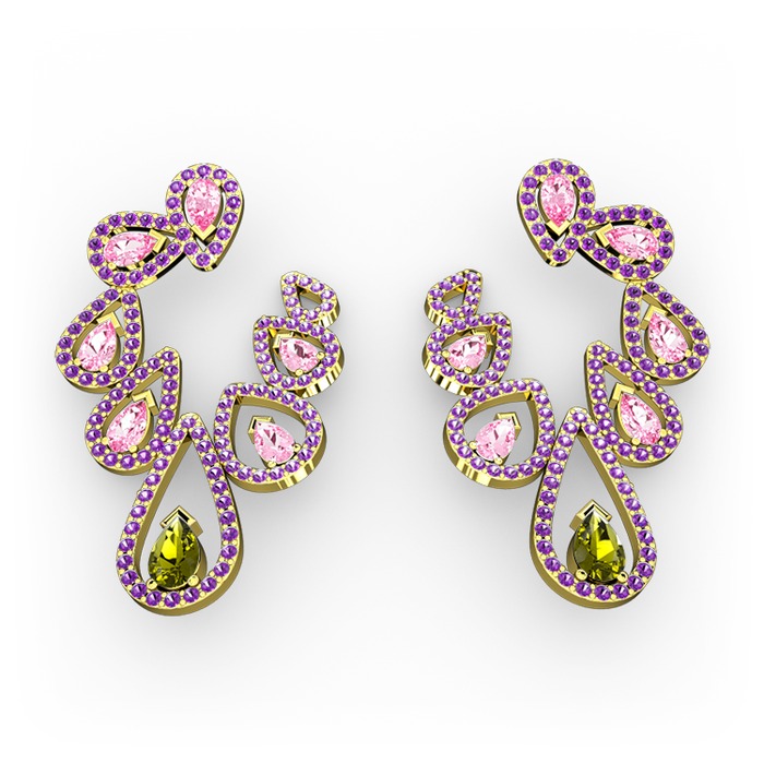 Peridot, pembe kuvars ve ametist 925 ayar altın kaplama gümüş küpe