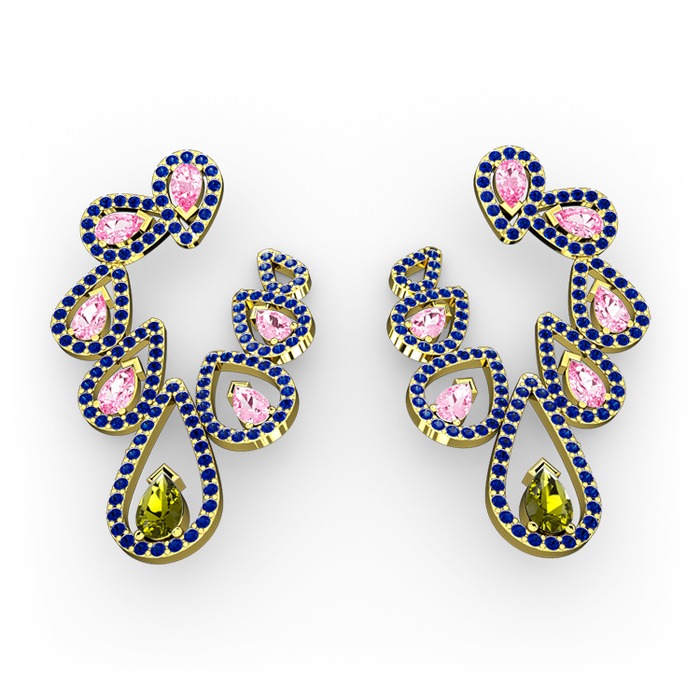 Peridot, pembe kuvars ve lab safir 18 ayar altın küpe