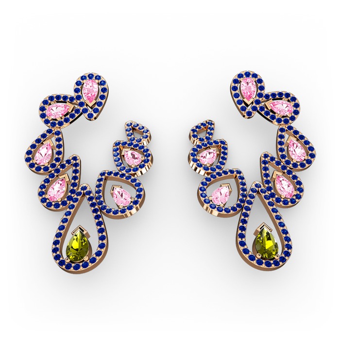Peridot, pembe kuvars ve lab safir 18 ayar rose altın küpe