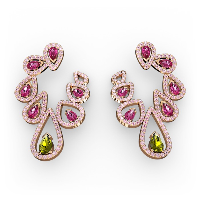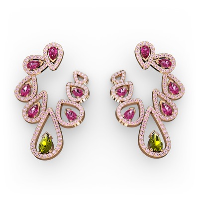 Peridot, rodolit garnet ve pembe kuvars 18 ayar rose altın küpe