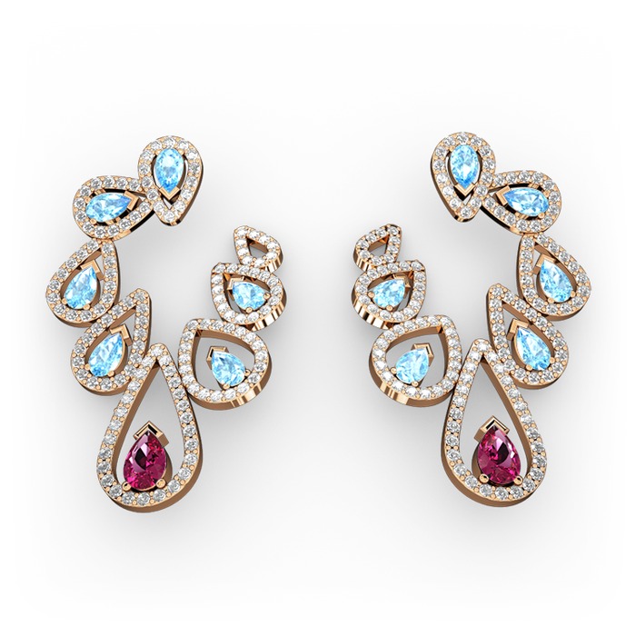 Rodolit garnet, akuamarin ve pırlanta 18 ayar rose altın küpe (2.882 karat)