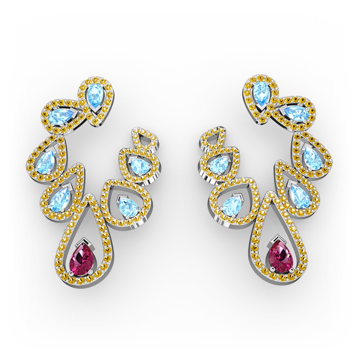 Rodolit garnet, akuamarin ve sitrin 14 ayar beyaz altın küpe