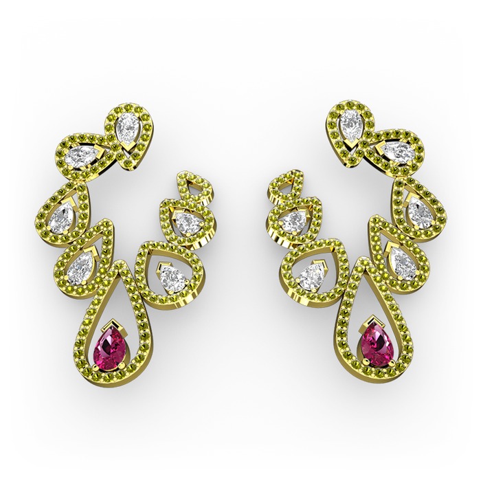 Rodolit garnet, beyaz zirkon ve peridot 18 ayar altın küpe