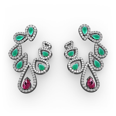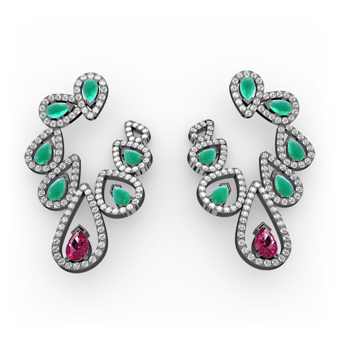 Rodolit garnet, kök zümrüt ve beyaz zirkon 925 ayar siyah rodyum kaplama gümüş küpe