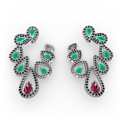 Rodolit garnet, kök zümrüt ve siyah zirkon 14 ayar beyaz altın küpe