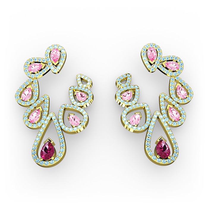 Rodolit garnet, pembe kuvars ve akuamarin 18 ayar altın küpe