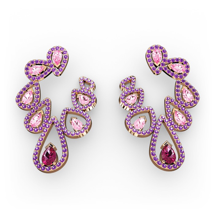 Rodolit garnet, pembe kuvars ve ametist 14 ayar rose altın küpe